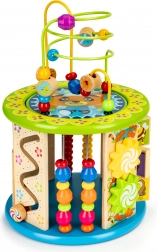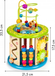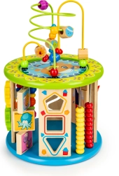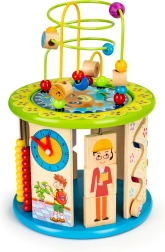 Ta izobraževalna kocka ECOTOYS prinaša številne funkcije v enem. Odstranljiv pokrov z žičnim labirintom in biseri razvija koordinacijo oko–roka, stranske stene z razvrščanjem oblik, vrtljivimi elementi in premičnimi zobniki podpirajo logično razmišljanje in ročne spretnosti. Zaradi lesene izvedbe je igrača stabilna, trpežna in prijetna na dotik.