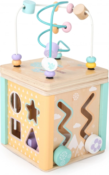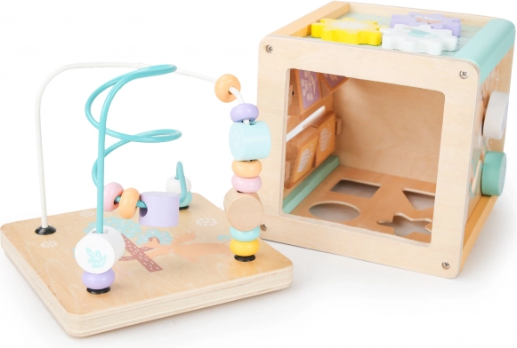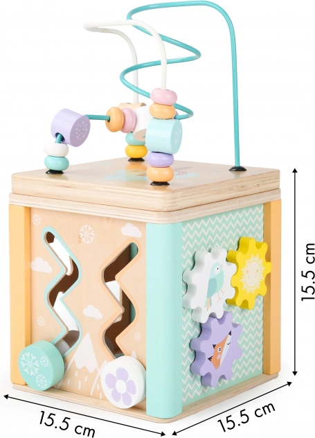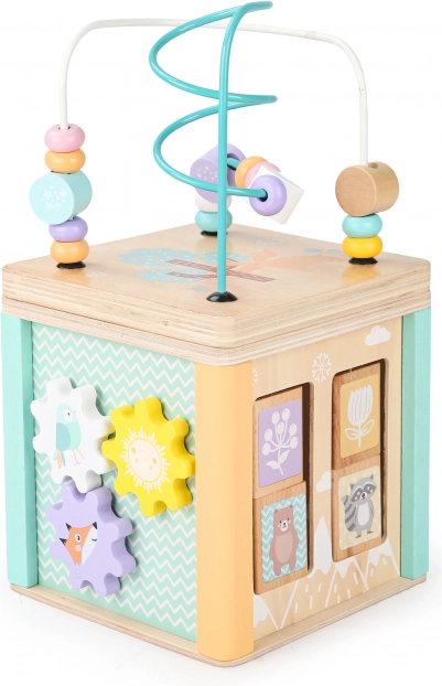 Vsaka stran kocke ponuja različne igralne elemente, kot so labirint, drsne sestavljanke ali vrtljiva zobnika, ki podpirajo otrokove motorične in kognitivne spretnosti.