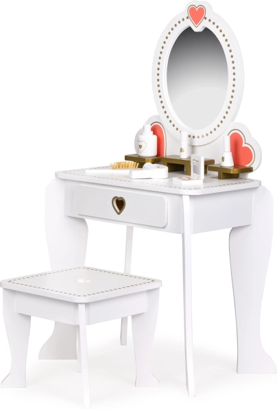 Toaletna mizica z velikim ogledalom in dekorativnim okvirjem s srčnimi motivi je popolna za igro male princese ali stilistke. Konstrukcija je varna in nudi veliko prostora za domišljijsko igro.