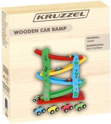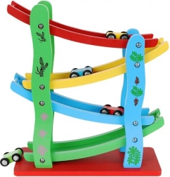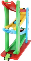 Set vključuje leseno tobogan s 4 raznobarvnimi stezami in 4 avtomobilčki. Vse je narejeno iz lesa, kar zagotavlja visok standard varnosti.
