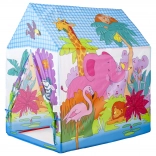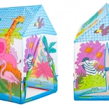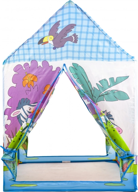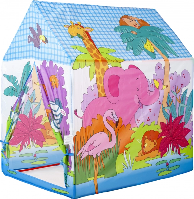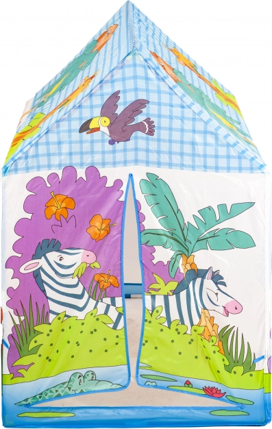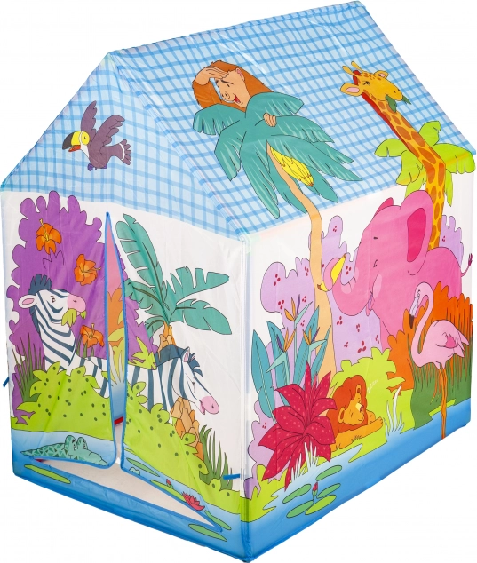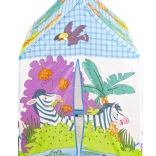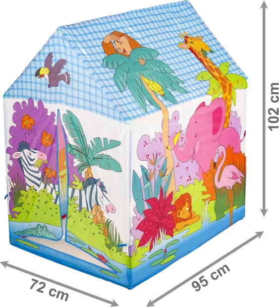 Hišni šotor s pestrimi ilustracijami džungle in živalic (slon, žirafa, zebra idr.) bo navdušil vsakega malega raziskovalca. Zaradi lahke plastične konstrukcije in trpežne poliestrske prevleke je idealen za igro v otroški sobi ter na terasi ali vrtu.
