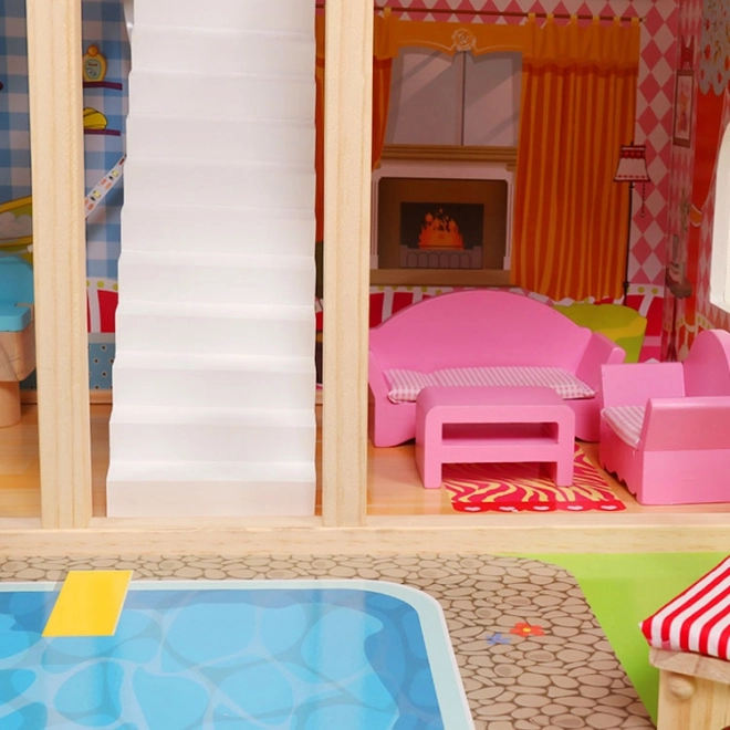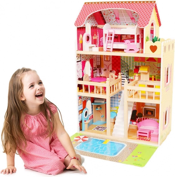 Velika lesena hišica za punčke ECOTOYS ponuja 3 nadstropja in 6 prostorov, LED osvetlitev za čarobno vzdušje ter 16 kosov lesenega pohištva. Stabilna in varna konstrukcija je idealna za otroke od 3 let in spodbuja domišljijo, ustvarjalnost ter fino motoriko. Priložena je tudi igriva podloga z motivom bazena za še zabavnejšo igro.