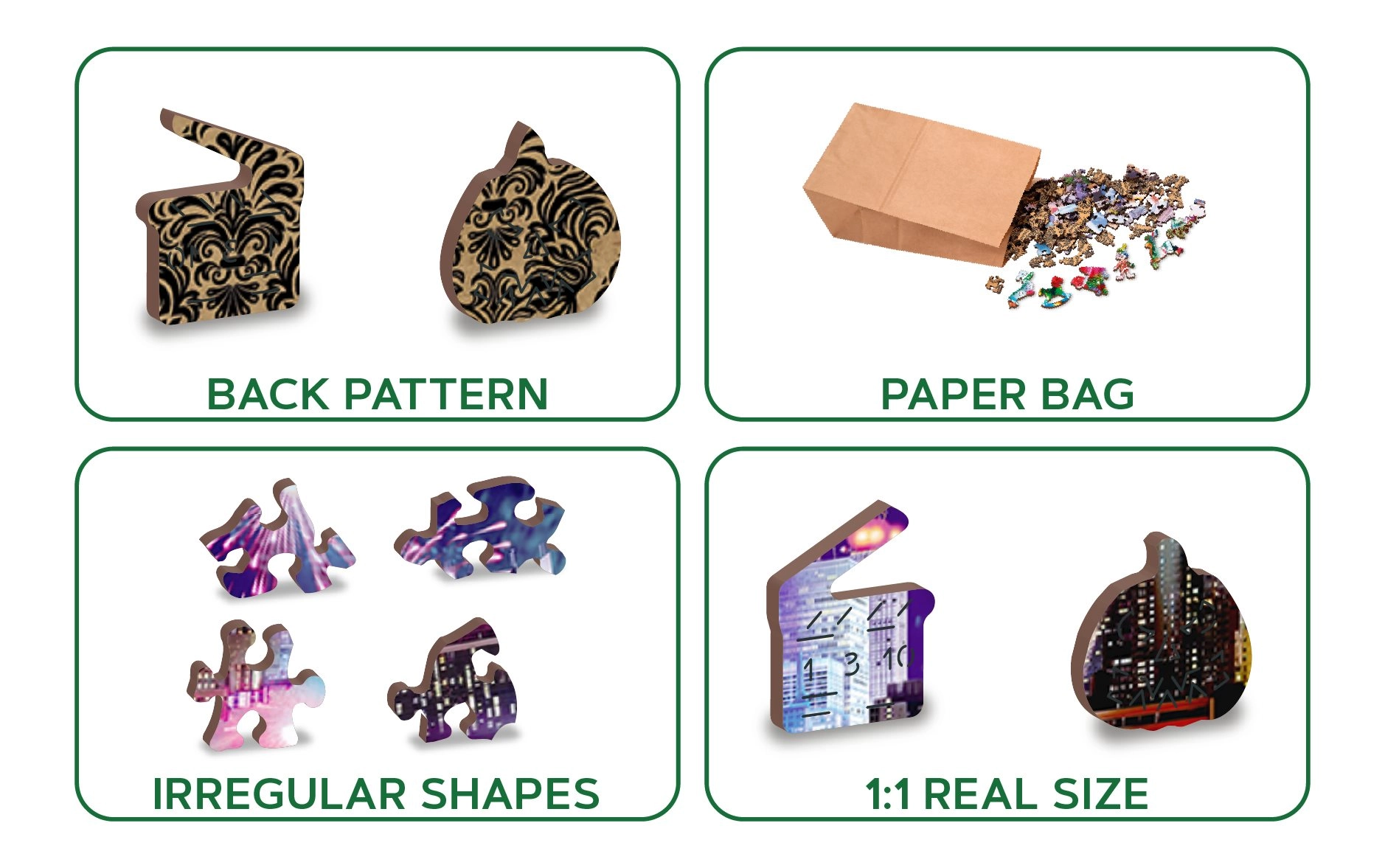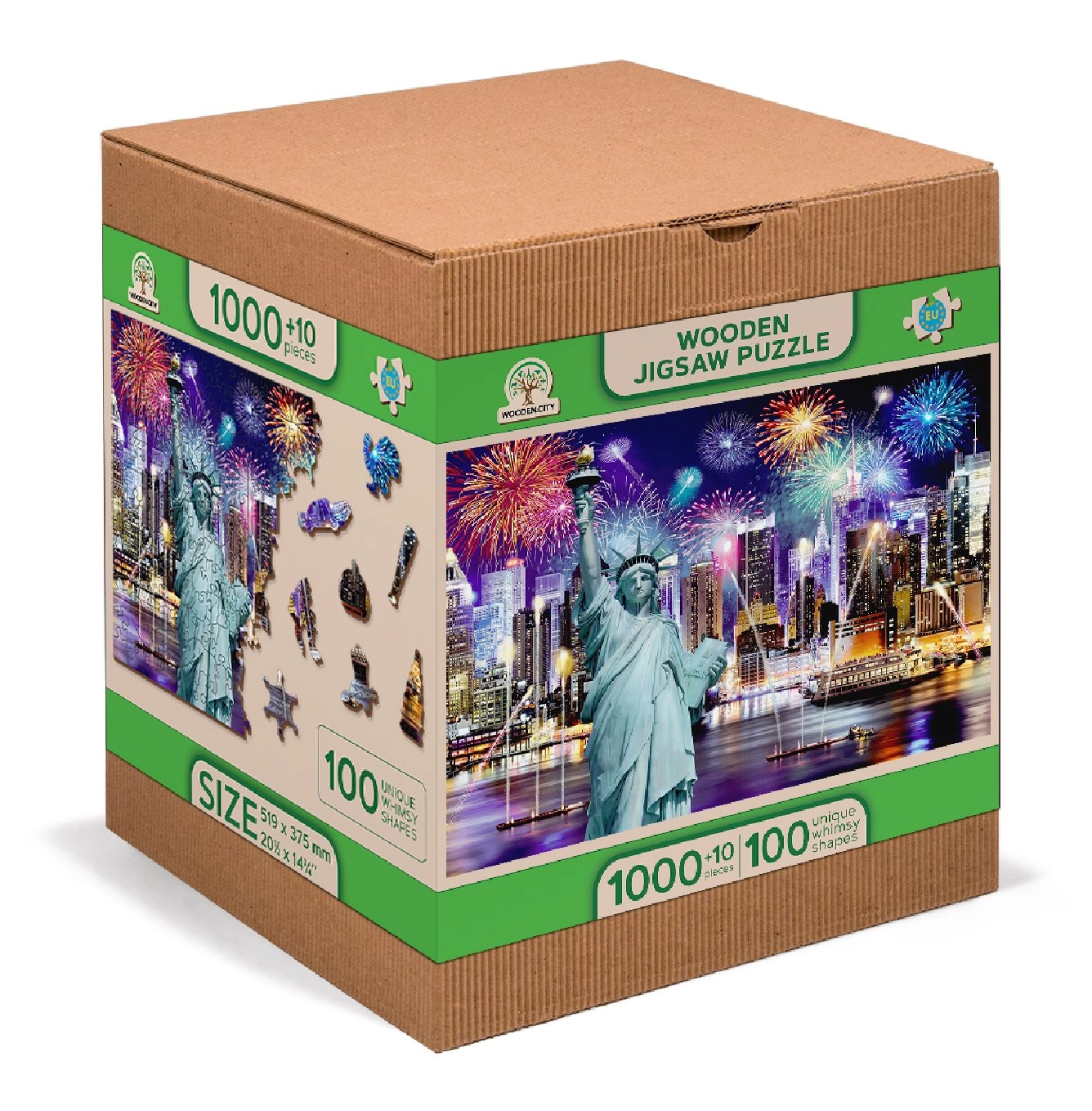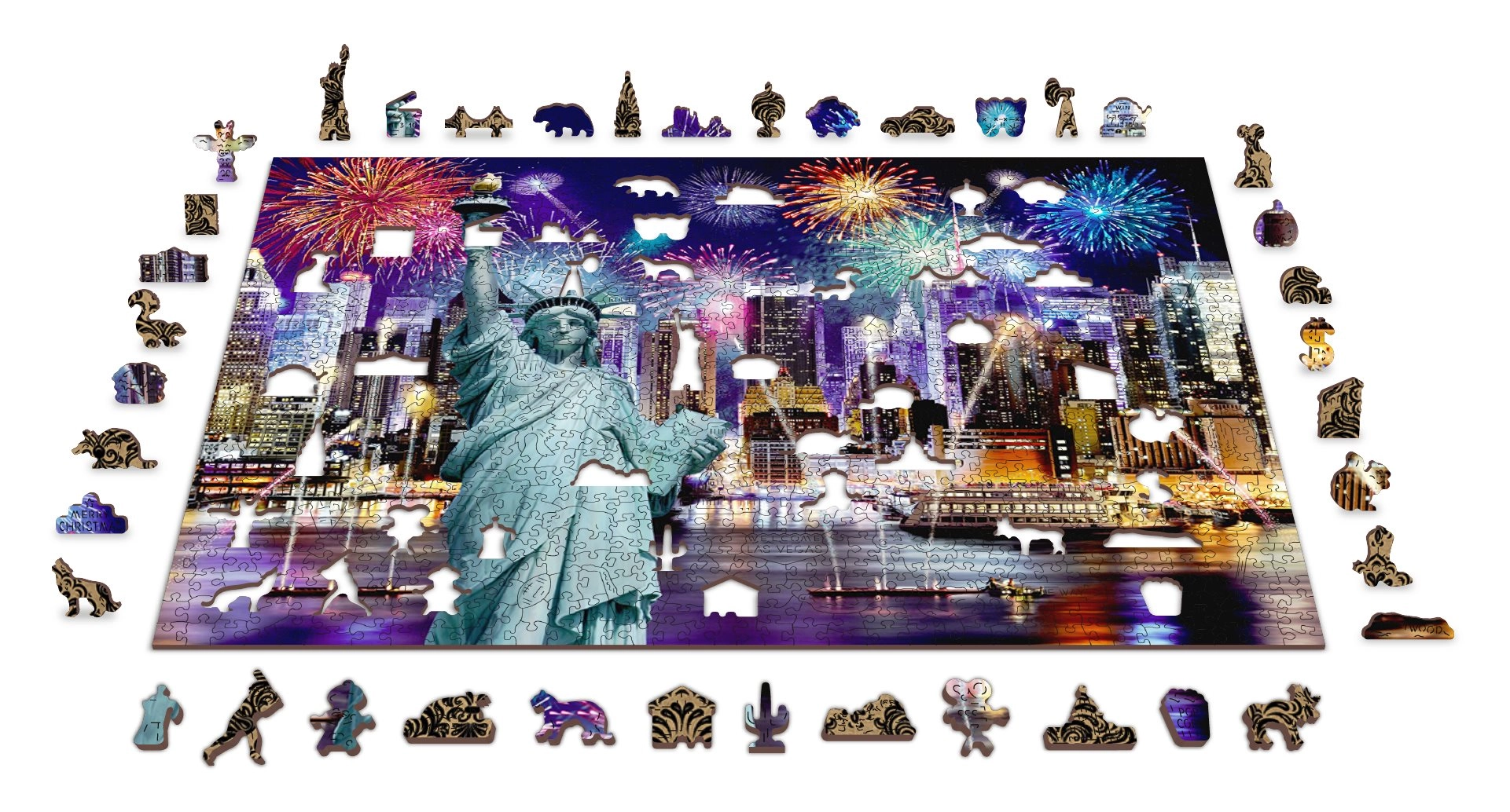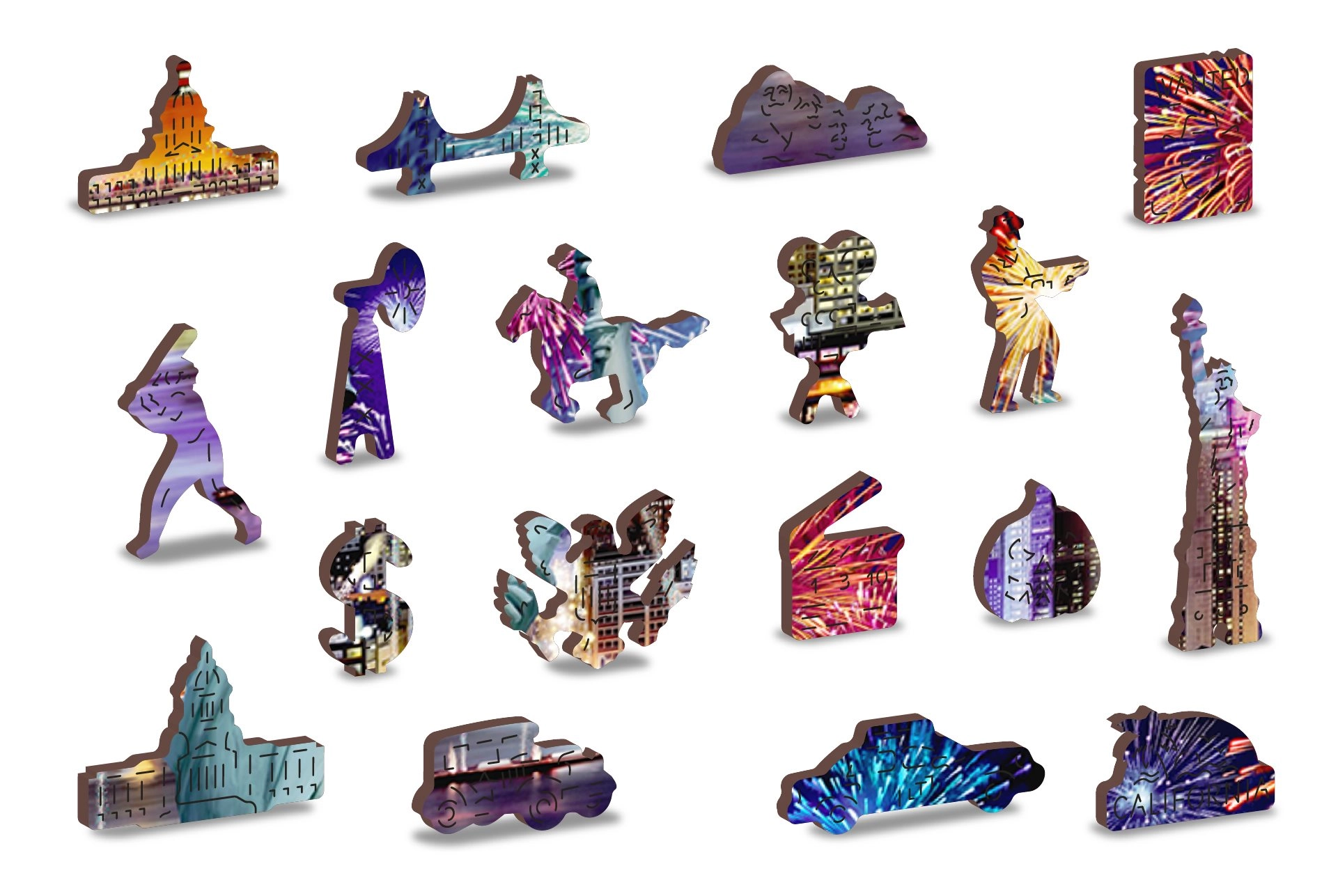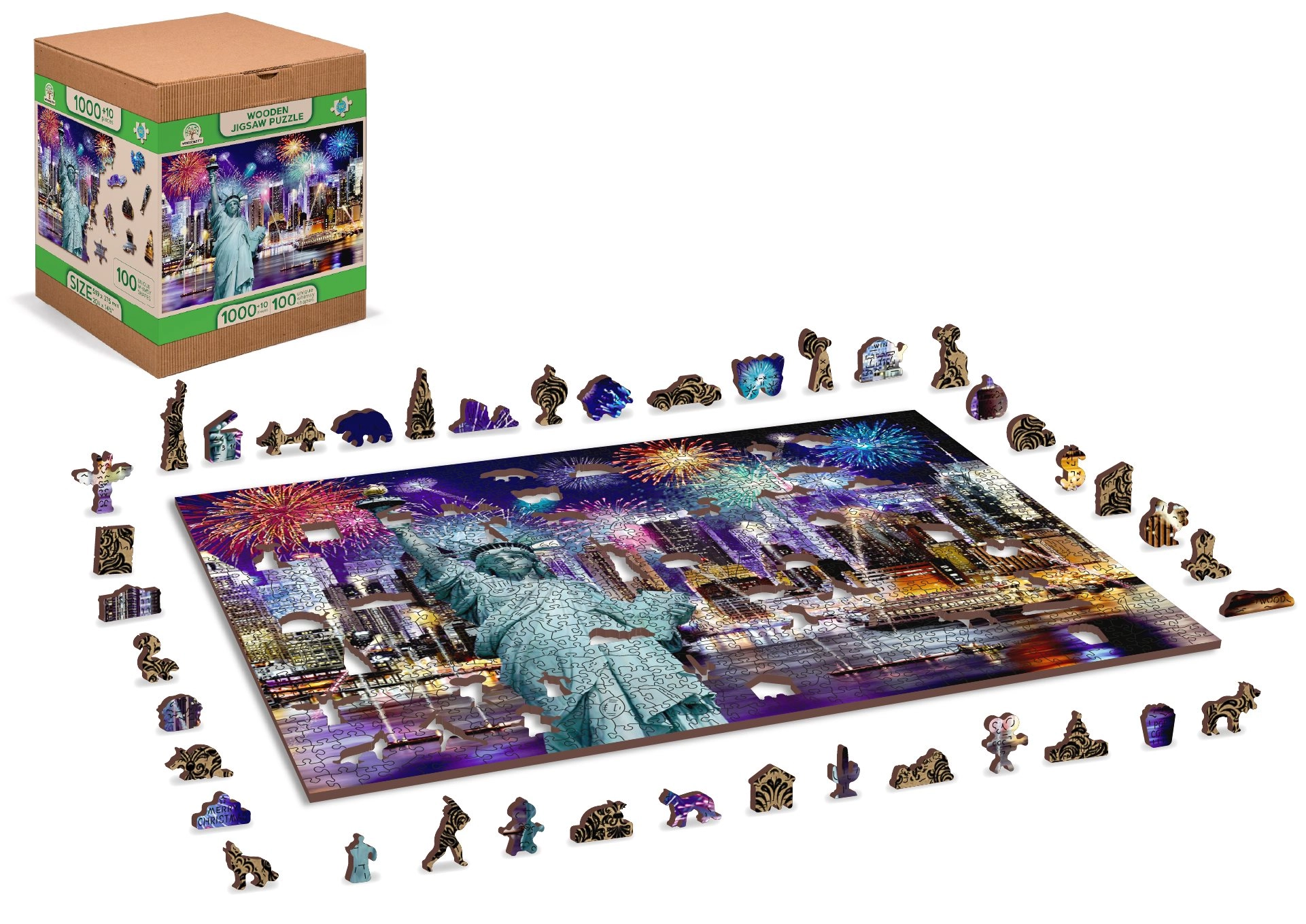 Podajte se v Nočni New York z našimi razkošnimi lesenimi puzzle 2v1. Natančno izrezane iz kakovostnega materiala ponujajo edinstveno oblikovane koščke, ki samostojno tvorijo živali, predmete ali zgradbe, hkrati pa so prijazne do okolja.