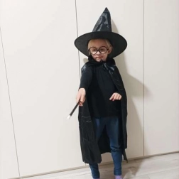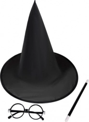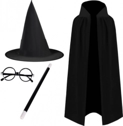 Ta stilski čarovniški kostum ponuja vse, kar otroci potrebujejo za ustvarjanje učinkovite in varne preobleke. Lahek plašč iz prijetnega materiala elegantno pada in zahvaljujoč zavezovanju dobro ostane na mestu. Špičast klobuk se po odvzetju sam razpre in pričara “wow” učinek. Okrogla očala brez stekel so udobna in varna pri igri, palica iz trpežne plastike pa odlično dopolni vsak trik.