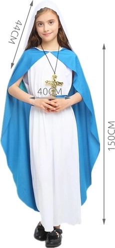 Eleganten otroški kostum Device Marije vključuje dolgo belo obleko s pritrjenim modrim plaščem, ujemajočim se pasom in belo pokrivalo za glavo. Visokokakovosten material zagotavlja, da je kostum mehak, lahek in udoben, ne omejuje gibanja in je odličen za božične igre, praznične nastope, verske dogodke ter pustne zabave. Avtentičen videz in brezčasen dizajn pomagata otrokom, da se zlahka vživijo v vlogo.