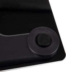 Slogovna črna platforma iz 0,3 cm kaljenega stekla prenese do 180 kg ter nudi stabilno in varno uporabo v kopalnici.