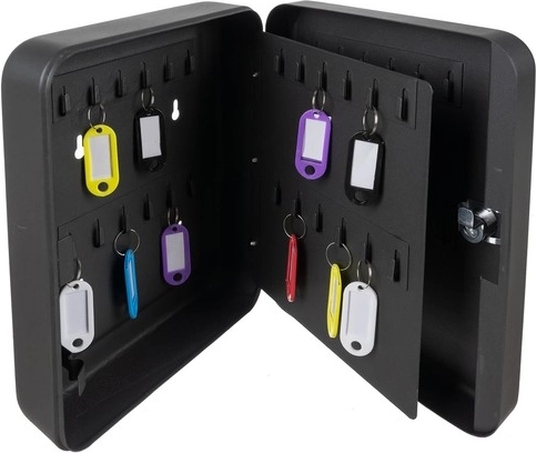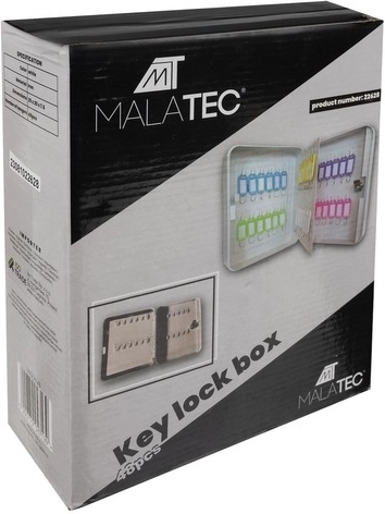 Praktična in trpežna omarica za ključe MALATEC je izdelana iz železa za višjo varnost in dolgo življenjsko dobo. V notranjosti sta dve trdni letvi in premična “knjižna” pregrada – skupaj 48 kavljev za ključe. Vsak kavelj lahko označite s številčno nalepko 1–48, tako ima vsak ključ svoje jasno določeno mesto.