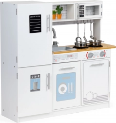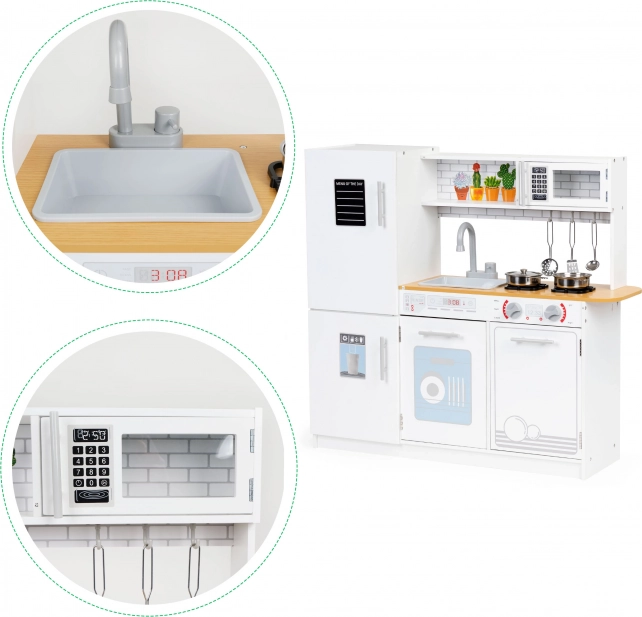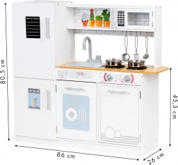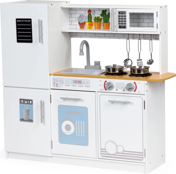 Ta otroška kuhinjica ponuja vse, kar potrebuje mali kuhar. Stabilna in trdna konstrukcija zagotavlja varnost pri igri. Otroci bodo uživali z vrtljivimi gumbi, odpirajočo pečico in mikrovalovno pečico ter prostornim hladilnikom z zamrzovalnikom. S to kuhinjico lahko otrok posnema odrasle kuharje in pridobiva prve kuharske veščine.