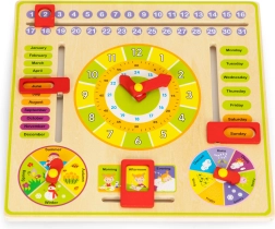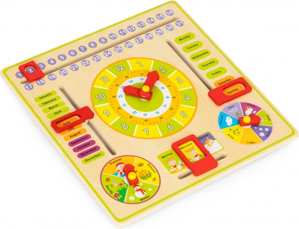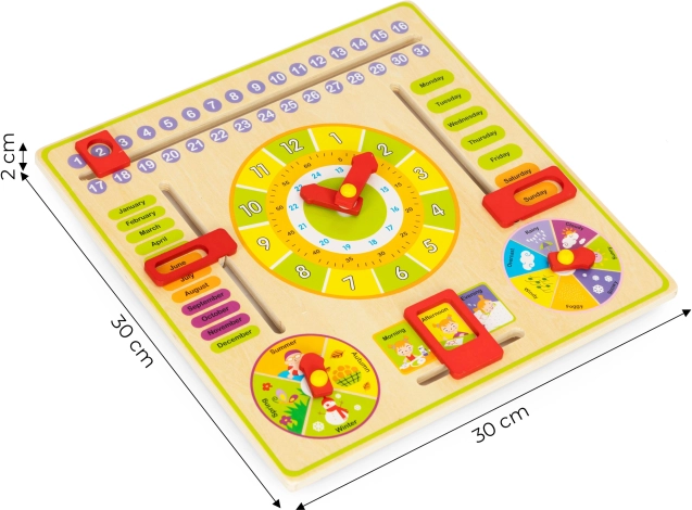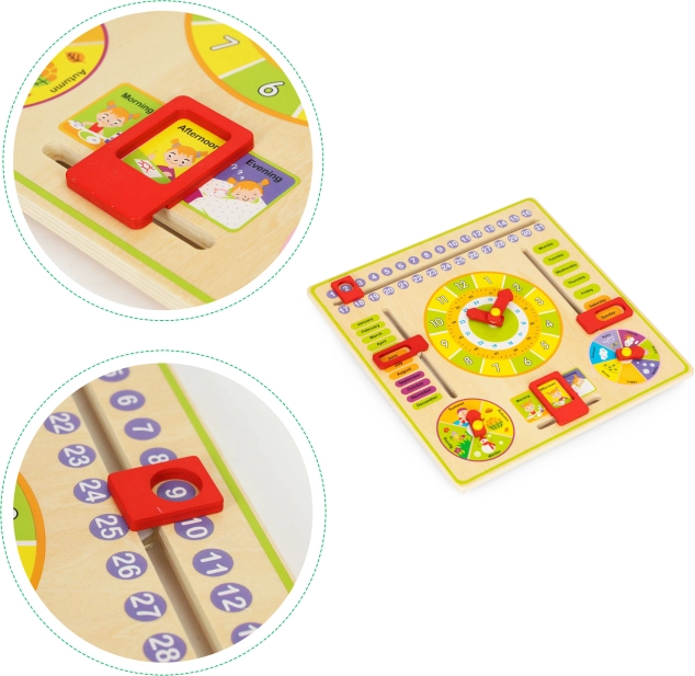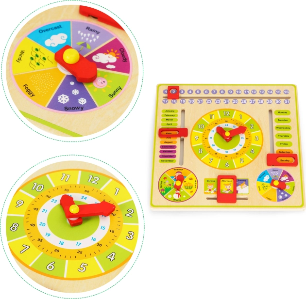 Tabla otrokom omogoča, da se naučijo dni v tednu, mesecev in letnih časov ter jim hkrati pomaga pravilno brati čas. Poleg tega razvija ročne spretnosti in ne vsebuje ostrih robov, kar je varno za otroke.