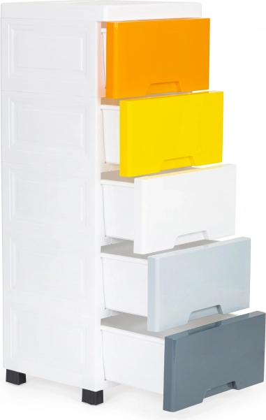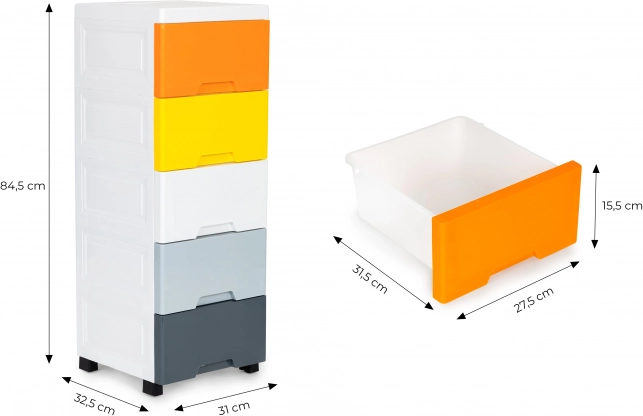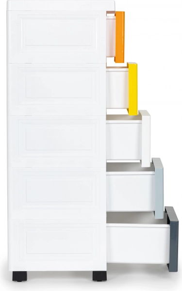 Uživajte v preglednem in stilsko urejenem shranjevanju igrač, kozmetike ali drobnarij. Ta visok in ozek organizator prihrani prostor, medtem ko pet prostornih predalov v različnih barvah pomaga pri razvrščanju in hitrem iskanju stvari. Čist bel okvir se poda sodobnim interierjem in je enostaven za vzdrževanje.