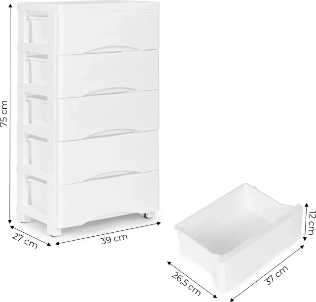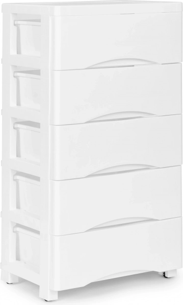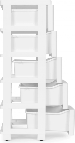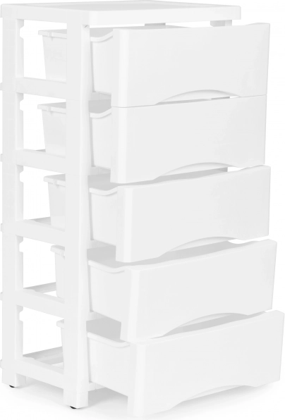 Ohranite red v domu in pisarni. Ta praktičen predalnik s petimi predali omogoča pregledno shranjevanje kozmetike, drogerijskih izdelkov, igrač, blokov in pisarniških potrebščin. Zahvaljujoč ergonomskim ročajem se predali udobno izvlečejo, univerzalna bela barva pa se poda tako modernim kot klasičnim interierjem.