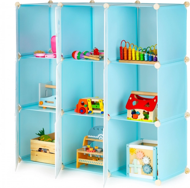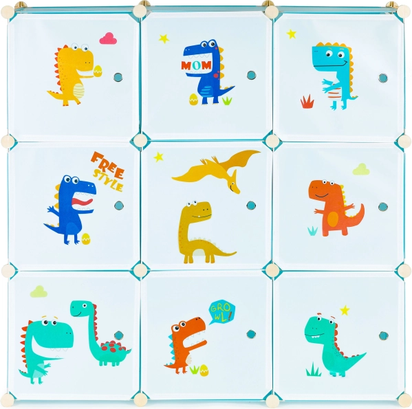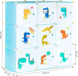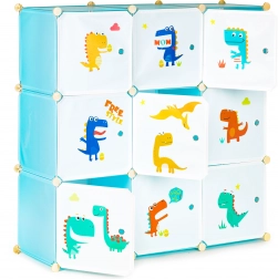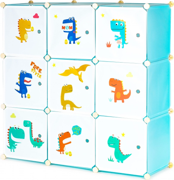 Ta modularna omara za otroško sobo združuje zabaven dizajn z vsakodnevno funkcionalnostjo. Devet zaprtih kubusov z barvnimi potiski dinozavrov poskrbi za pregledno shranjevanje in spodbuja otroke k samostojnemu vzdrževanju reda. Zahvaljujoč odpornim polipropilenskim ploščam in ojačanemu kovinskemu okvirju je omara lahka, a stabilna.