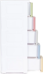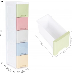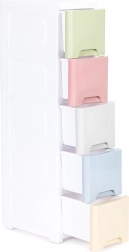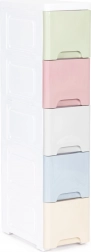 Ta ozek plastični regal s petimi izvlečnimi predali prinaša pametno in pregledno shranjevanje igrač, kozmetike in drobnarij v gospodinjstvu. Zahvaljujoč kolescem ga zlahka premaknete tja, kjer je trenutno potreben, profilirani ročaji na čelni strani predalov pa omogočajo udobno odpiranje.