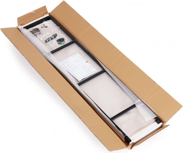 Okvir iz kvadratnih profilov 12 mm zagotavlja trdnost in stabilnost, medtem ko nastavljive zaščitne nogice preprečujejo poškodbe tal. V paketu sta trak in vijaki za pritrditev na steno za večjo varnost. Izdelek je pakiran v posebej ojačan karton z izpolnili za zanesljivo zaščito med prevozom.
