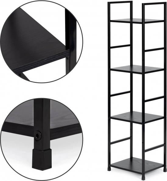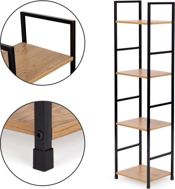 Ta moderna knjižna omara v loft slogu združuje praškasto lakirano kovino in police iz MDF z lesenim dekorjem. Višina 112 cm in kompaktna zasnova sta kot nalašč za manjše prostore, kjer maksimalno izkoristita prostor za knjige, dekoracije, rastline ali kopalniške dodatke. Vsaka polica meri 23,5 × 29 cm, razmak med policami pa je 31 cm, zato lahko udobno shranite vse, kar želite imeti pri roki.