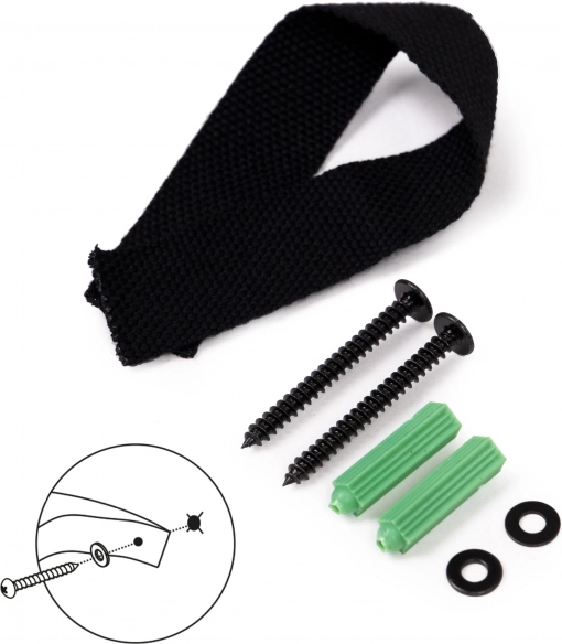V paketu sta priloženi trak in vijaki za pritrditev na steno – večja stabilnost in varnost v gospodinjstvih z majhnimi otroki.