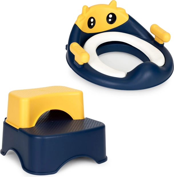Naš toaletni komplet združuje ustvarjalen pristop k oblikovanju z praktično rešitvijo za otroke, ki se učijo higiene. Ne bo le odlična pomoč pri učenju, temveč tudi izviren element opreme kopalnice. Nastavek za WC-školjko bo otroku pomagal postopno preiti od plenic k uporabi stranišča. Platforma z dvema stopničkama pomaga malčku splezati na stranišče, poleg tega pa jih lahko otrok uporablja tudi v drugih situacijah, npr. ko ne doseže do umivalnika.