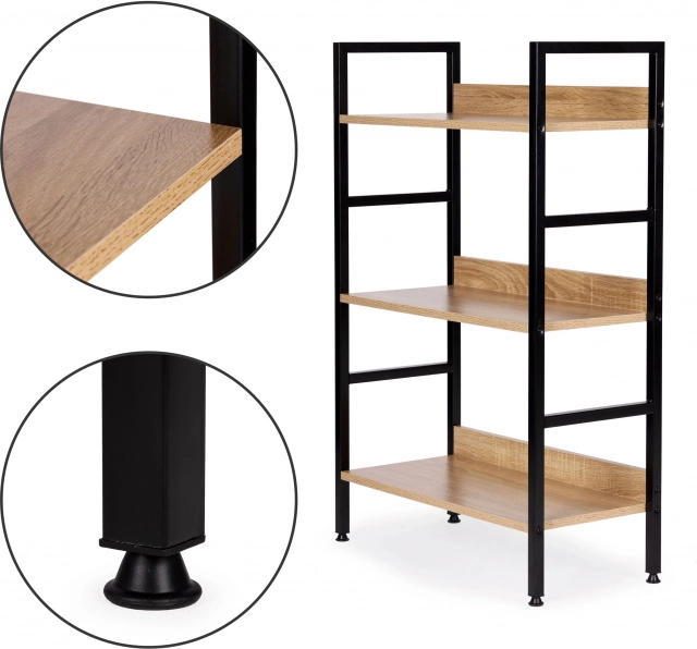 Stilska loft polica s tremi nivoji prinaša moderen dizajn, stabilno kovinsko konstrukcijo in univerzalno uporabo v dnevni sobi, spalnici, predsobi in kopalnici. Kakovostne MDF plošče z lesnim dekorjem na čvrstem prašnato lakiranem okvirju, nastavljive nogice z zaščito za tla ter enostavna montaža jo naredijo idealno shranjevalno rešitev za dekoracije, knjige in rastline.