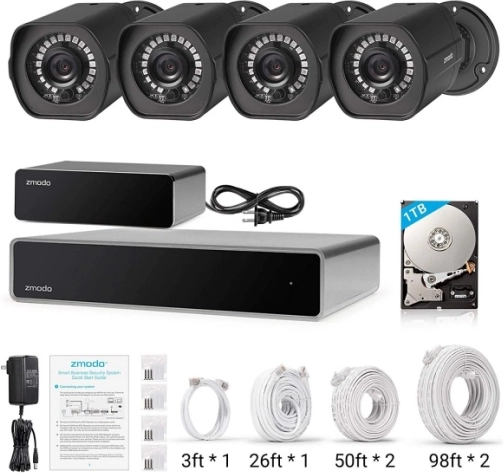 Namestitev je preprosta tudi brez strokovnega znanja: priključite snemalnik, repetitor in kamere – sistem začne samodejno snemati. Dostop do žive slike in posnetkov je mogoč prek aplikacije Zmodo (Android/iOS), Windows aplikacije Zviewer, spletne storitve Zmodo ali neposredno prek HDMI na monitorju. Kamere z IR LED in IR-cut filtrom zagotavljajo jasno sliko podnevi in ponoči do približno 20 m. Kovinsko ohišje z zaščito IP65 je idealno za notranjost in zunanjost.