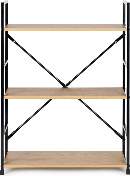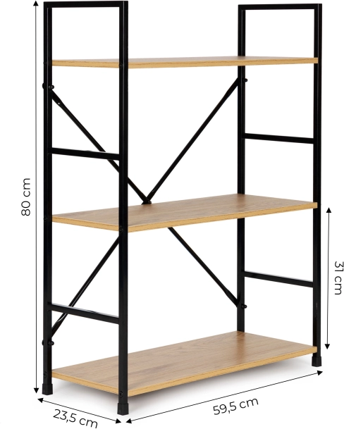 Konstrukcija je izdelana iz vzdržljive kovine s prašnim lakiranjem, police pa so iz MDF plošč z površinsko obdelavo v videzu lesa. Vsaka polica meri 59,5 x 23,5 cm, razdalja med policami pa je 31 cm, kar zagotavlja dovolj shranjevalnega prostora.