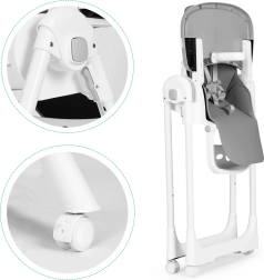 Kovinska konstrukcija se hitro zloži za prihranek prostora, kolesa z gumijastim tekalnim slojem in zavoro olajšajo premikanje brez prask na tleh. 5-točkovni varnostni pasovi in preprečilo zdrsa pod pladnjem povečujejo varnost. Prevleka iz eko usnja je trpežna in enostavna za čiščenje – idealna za vsakodnevno uporabo.