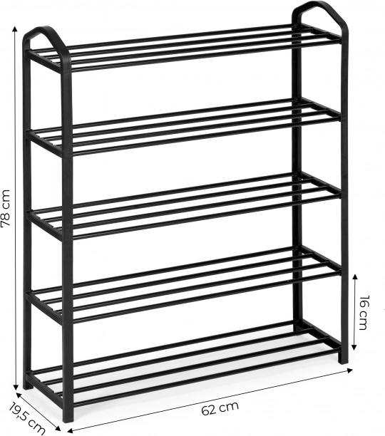 Ta kovinski stojalo za čevlje je popolna rešitev za vaš hodnik, garderobo ali celo pisarno. Pet polic omogoča shranjevanje do 15 parov vaših najljubših čevljev in njegova lahka konstrukcija zagotavlja stabilnost tudi pri polni obremenitvi.