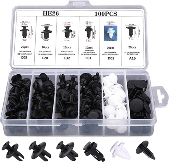 Komplet 100 avtomobilskih sponk. Vsebuje do 6 najbolj priljubljenih vrst sponk, razporejenih po 10 in 20 kosov. Priročno, kompaktno ohišje s predelki, ki preprečujejo mešanje elementov v kompletu. Vsi predelki kovčka so označeni, kar olajša iskanje prave sponke.