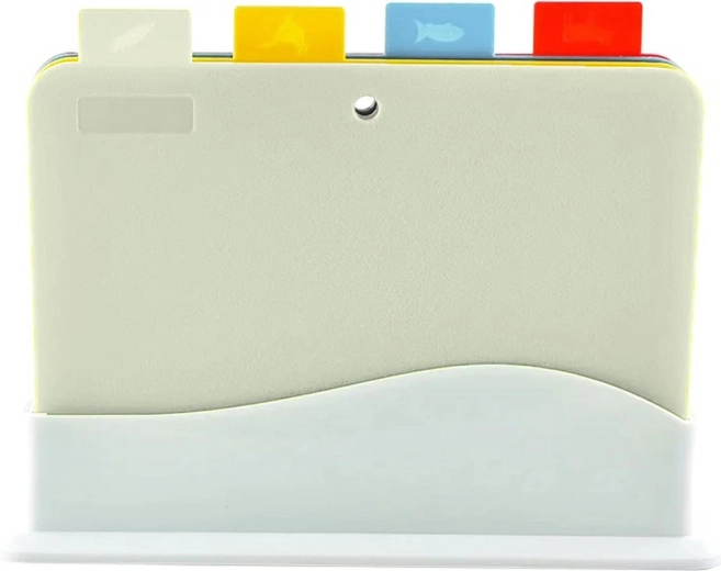 Komplet štirih barvnih rezalnih desk z namenskim stojalom. Barvna razporeditev olajša dodelitev posameznim vrstam živil in preprečuje prenos bakterij med njimi. Vsaka deska ima dodatno piktogram, ki označuje, za kaj je namenjena.
