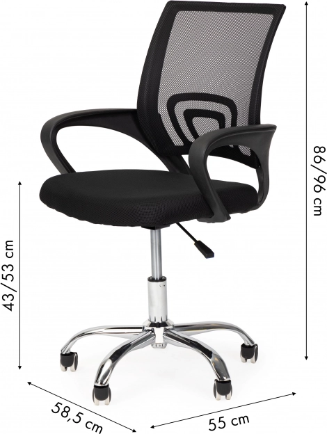 Stol je opremljen z enostavnimi mehanizmi za popolno nastavitev, kar ga naredi uporabniku prijaznega. Trpežna mrežica na naslonjalu zagotavlja dobro zračenje, medtem ko kovinsko, kromirano podnožje s petimi kolesi nudi stabilnost in mobilnost.