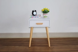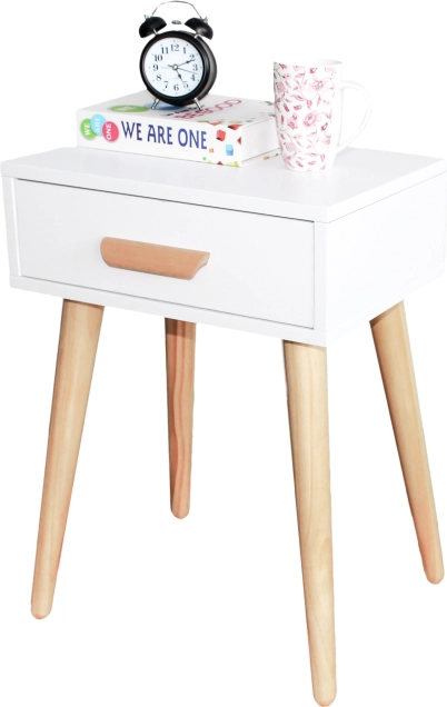 Čiste linije, bela barva in naraven les nog prostoru dodajo svežino in lahkotnost. Idealna kot nočna ali odlagalna mizica.