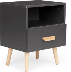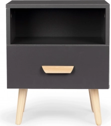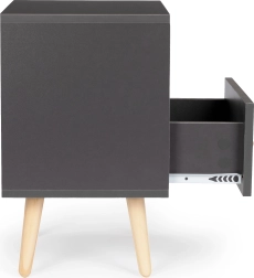 Funkcionalna razporeditev z enim predalom in odprto polico nudi prostor za knjige, telefon, budilko in drobnarije, ki jih želite imeti pri roki. Trpežne laminirane površine se enostavno čistijo, čvrsta konstrukcija pa zagotavlja dolgoročno stabilnost.