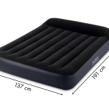 Napihljiva postelja INTEX je idealna za dve osebi – odlično se obnese za goste, na vikendu ali pri kampiranju. Zgornja plast z udobno velur prevleko je vodoodporna in prijetna za ležanje, medtem ko robusten PVC zagotavlja vzdržljivost. Vgrajena električna črpalka (220–240 V) pripravi ležišče za uporabo v približno 250 sekundah, velik ventil omogoča hitro izpihovanje in enostavno zlaganje.