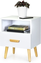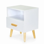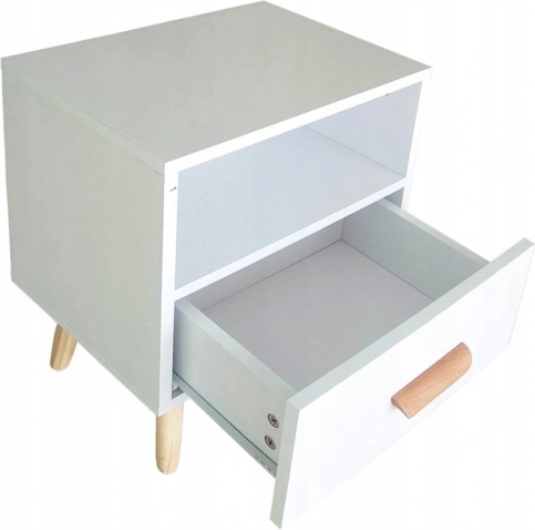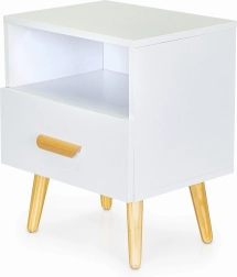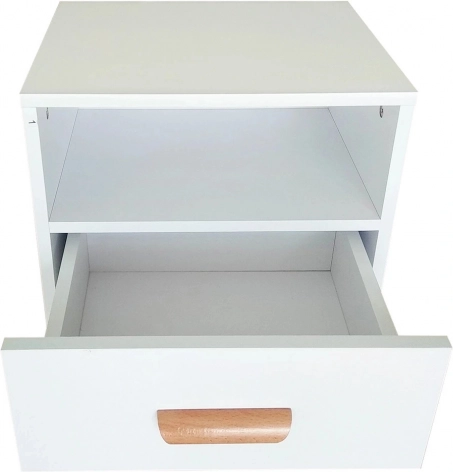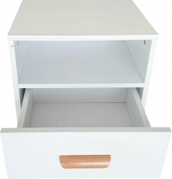 Nočna omarica ModernHome je idealna ob postelji ali kot odlagalna mizica v dnevni sobi ali predsobi. Združuje čisto belo barvo z naravnimi lesenimi elementi, zato se odlično poda v skandinavske in moderne interierje. Odprta polica nudi prostor za knjige ali dekoracije, prostoren predal pa skrije drobnarije, ki jih želite imeti pri roki.