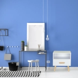Kombinacija odprte police in prostornega predala poskrbi za red – od knjig in revij do osebnih drobnarij, telefona ali budilke.