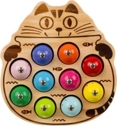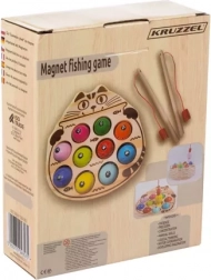 Komplet vključuje leseno ploščo v obliki mačke, 10 magnetnih ribic in 2 magnetni palici.