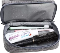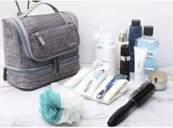 Torbica je izdelana iz materialov, ki odbijajo vodo, kar je idealno za uporabo v kopalnici ali na poti.