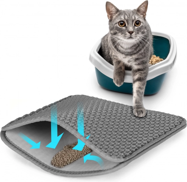 Brez več raznašanja steliva po stanovanju. Dvoplastna podloga PETSI s satjasto/mrežasto strukturo ujame granule steliva takoj pri izhodu iz stranišča. Nečistoče padejo v spodnjo komoro, od koder jih v trenutku stresete nazaj v stranišče ali v koš.