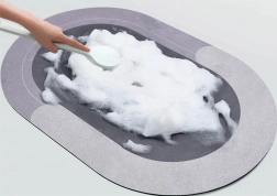 Ta moderna kopalniška preproga v modrih odtenkih učinkovito vpija vodo in se hitro suši, zato tla po tuširanju ali kopeli ne ostanejo spolzka. Nedrseča spodnja plast trdno drži na ploščicah in povečuje varnost pri vsakodnevni uporabi.