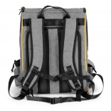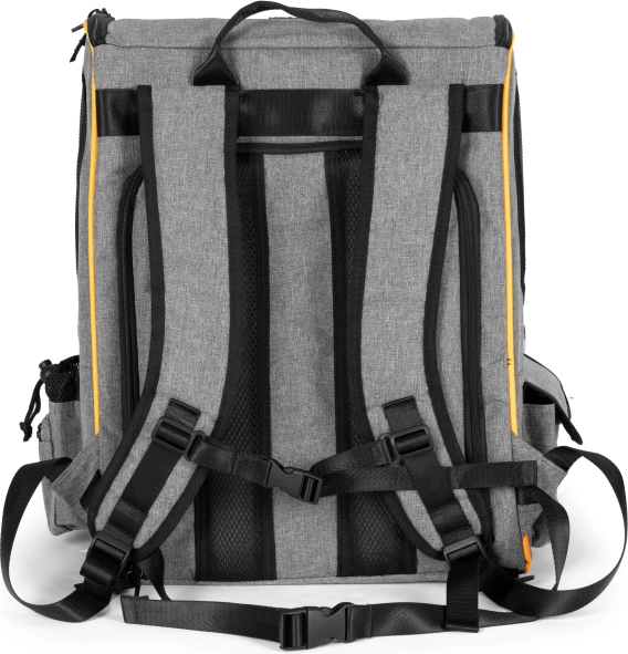 Za udobno nošenje poskrbijo široke oblazinjene naramnice, ki jih dopolnjujeta prsni in ledveni pas za stabilnost. V notranjosti sta mehka podloga in varnostna karabinka za ovratnico. Stranska žepa sprejmeta povodec, priboljške ali vrečke – en žep ima praktičen odprtino za enostavno izvlek vrečk.
