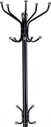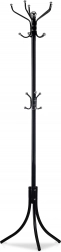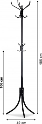 Stilski obešalnik v brezčasni črni barvi je praktična rešitev za red v predsobi in pisarni. Zgornji del sestavlja pet krakov, vsak z dvema držaloma za udobno obešanje oblačil. V srednjem delu so trije manjši kavlji za torbice, šale ali dežnike. Trdna kovinska konstrukcija in stabilen trinožni podstavek zagotavljata zanesljivost pri vsakodnevni uporabi.