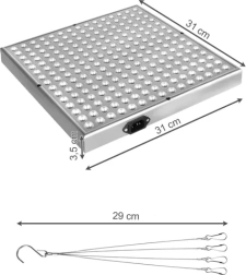 Namestitev je hitra in nezahtevna: panel le priključite v omrežje in obesite nad rastline s priloženimi jeklenicami. Kompaktne mere 31 × 31 × 3,5 cm in lahka zasnova olajšajo postavitev v rastlinjaku, gojitvenem boksu ali na domačem okenskem polici.