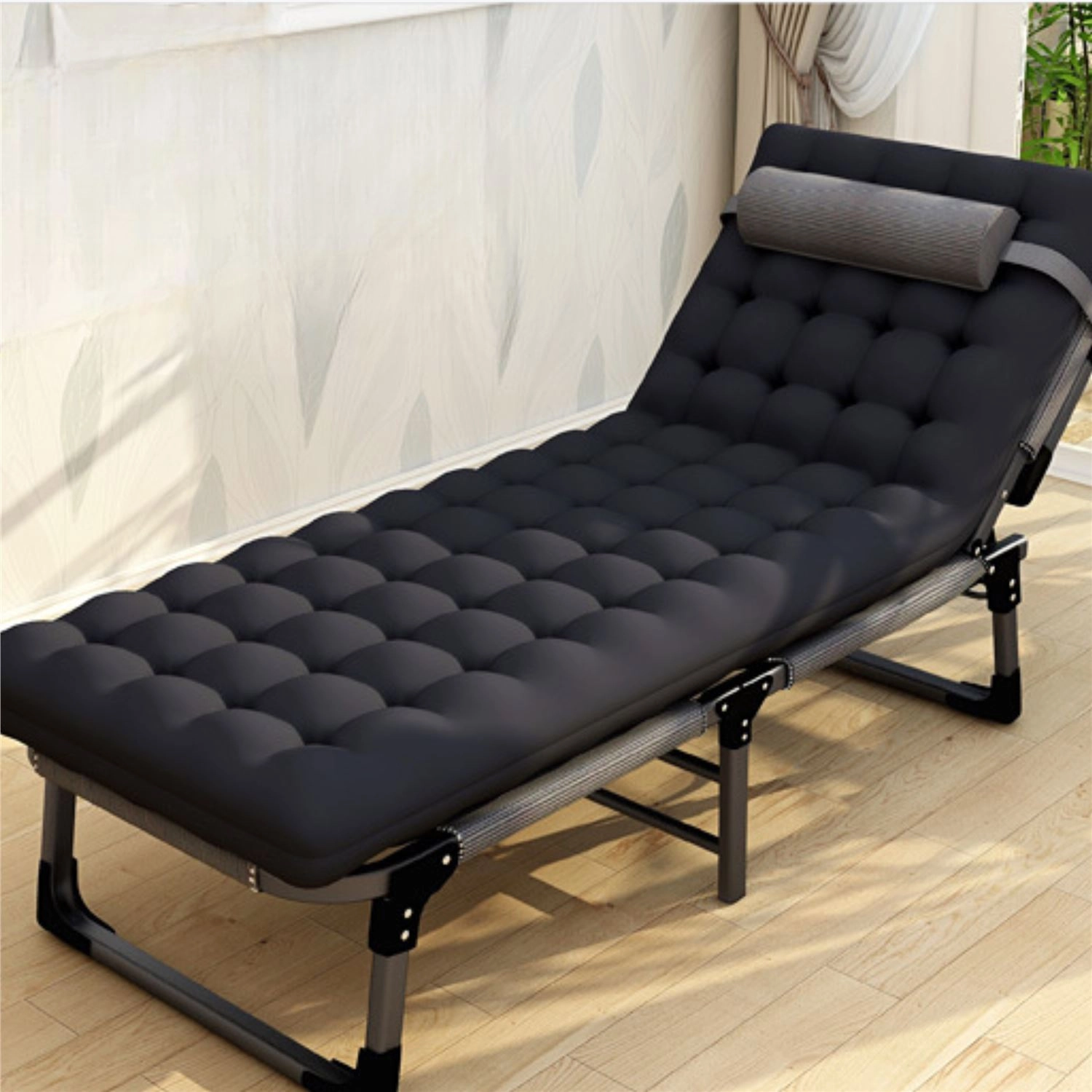 Ta zložljiva postelja je idealna kot zasilno ležišče za goste, za sprostitev v pisarni ali počitek na kampiranju. Robusten jeklen okvir z zaklepnim mehanizmom zagotavlja izjemno stabilnost brez neželenega zibanja, medtem ko zračna prevleka iz tkanine Oxford in debelo polnilo iz perlaste bombažne vate nudita udobno ležanje.