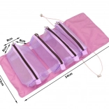 Odličen za kozmetiko, nakit, higienske pripomočke in drobne dodatke. Zahvaljujoč visečemu kavlju ga preprosto namestite v kopalnici ali na poti. Lahek tekstilni material in kompaktne mere ga naredijo idealnega spremljevalca za torbico, nahrbtnik in kovček.