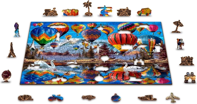 Elegant izziv in zabava za ljubitelje sestavljank. Lesena sestavljanka s motivom toplozračnih balonov ponuja edinstveno izkušnjo zahvaljujoč 61 posebno oblikovanim koščkom v oblikah živali, zgradb in predmetov. Nekatere lahko postavite kot majhne figurice, kar sestavljanko spremeni v odlično darilo in stilno dekoracijo.