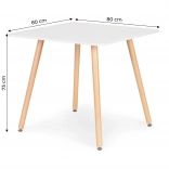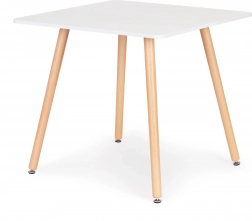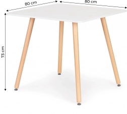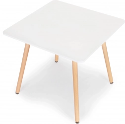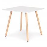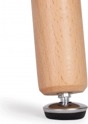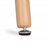 Noge mize so izdelane iz vzdržljivega bukovega lesa, na njihovih koncih so posebne gibljive nogice, ki pomagajo izravnati mizo in preprečujejo praskanje tal. Plošča je iz MDF-plošče, prevlečene z odporno mat belo furnirano prevleko, pod njo pa je kovinski okvir, v katerega so vpete noge mize.