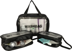 Komplet vsebuje tri torbice v različnih velikostih za pregledno organizacijo vseh potrebnih izdelkov.