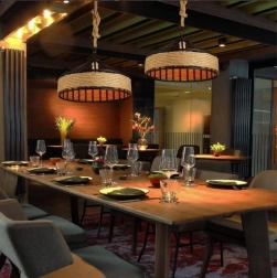 Popestrite dom z izrazito visečo svetilko, ki združuje robustno kovino in naravno konopljino vrv. Zaradi izvirne oblike in toplega sijaja je odlična za dnevno sobo, jedilnico ali nad kuhinjski otok. V komercialnih prostorih – od kavarn do butičnih hotelov – ustvari prijetno in zapomnljivo atmosfero.