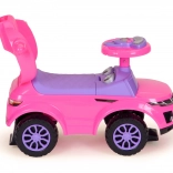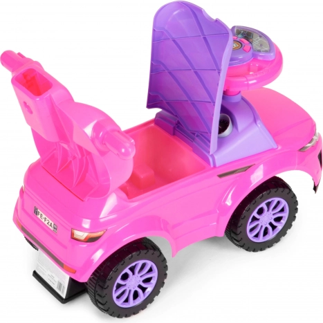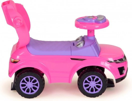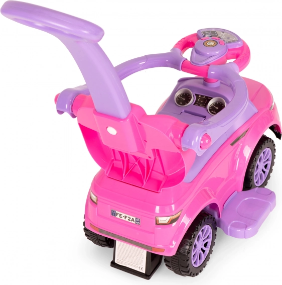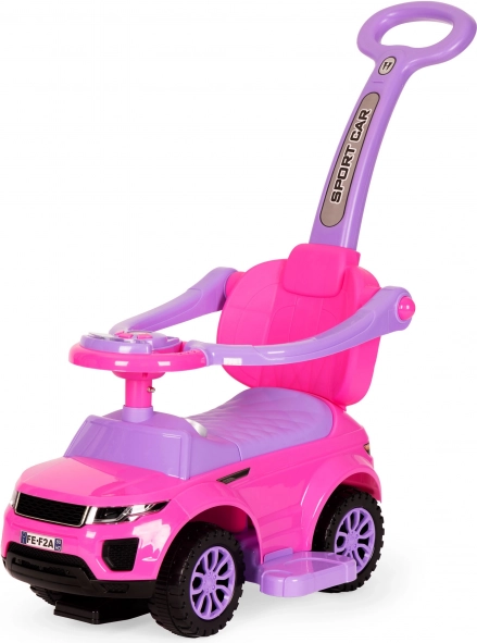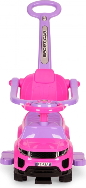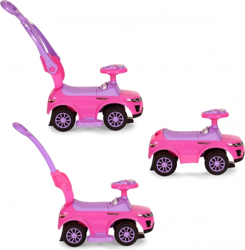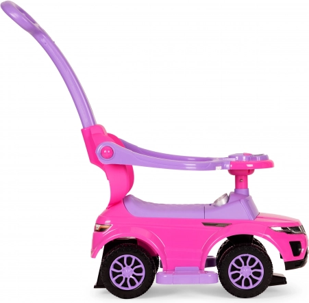 Stilski poganjalec 3-v-1 v rožnati barvi raste z otrokom in ponuja varno, stabilno in vzdržljivo konstrukcijo, vodilni ročaj za starše, zložljive varnostne ograje, odstranljive stopalke in shranjevalni prostor pod sedežem. Interaktivni multimedijski volan z zvoki in lučmi poskrbi za še več zabave, medtem ko zaščita proti prevrnitvi zagotavlja maksimalno zanesljivost pri vožnji doma in na prostem.