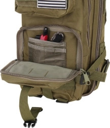 Nahrbtnik ponuja številne predale, vključno s prostorno glavno žepom, ki se odpira do spodnjega roba za enostaven dostop do vsebine.