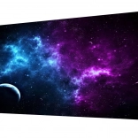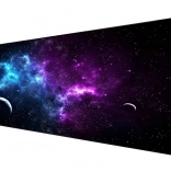 Zaradi vodoodporne obdelave prenese nenamerno polivanje, obrobljeni robovi pa preprečujejo cefranje. Vesoljska grafika v odtenkih modre in vijolične doda vašemu setupu edinstven videz – od pisarne do igralnega kotička.